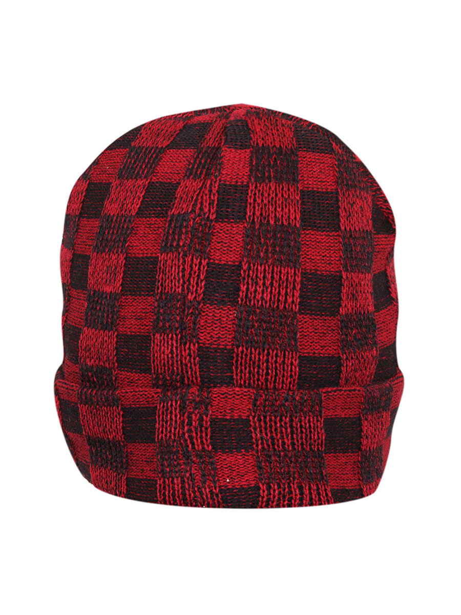 - Red self design beanie, has a visor