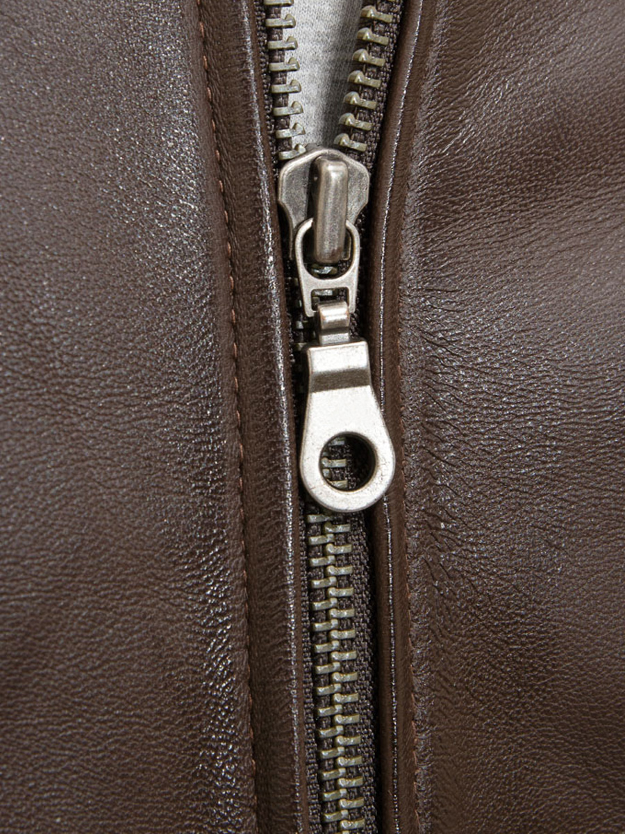 - A clean and simple brown, leather bomber jacket. Sheep nappa leather is the perfect hide for this jacket with a soft and supple handle and a deep colour density. The styling follows the template of a blouson body, rib knit collar, cuffs and hem plus flapped waist pockets. Everything you need in a jacket and nothing more. The interior is fully lined in a plain poplin and carries one, leather trimmed pocket.