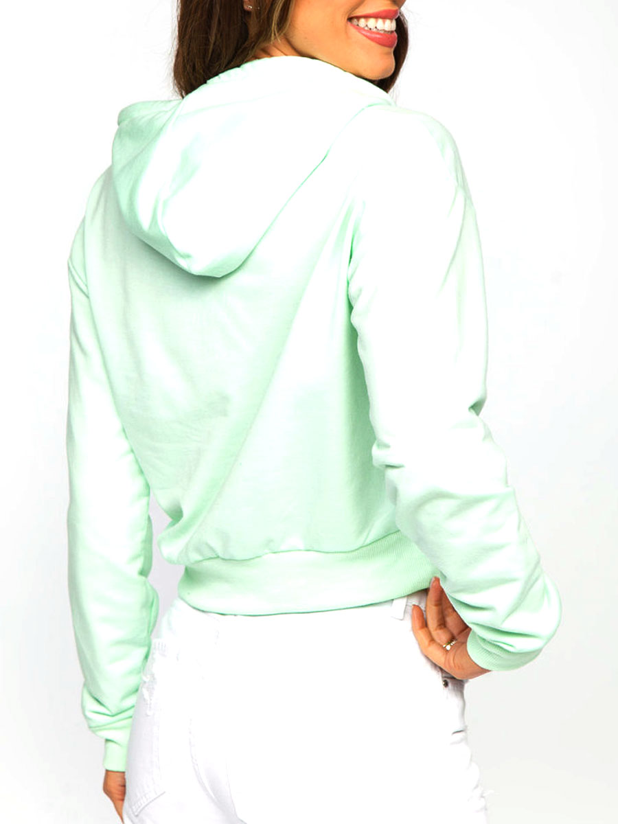 Eye-catching mint women's sweatshirt from the JDN collection. The hoodie is pulled over the head and has a drawstring adjustable hood. The bottom and sleeves are finished with a welt, which allows for a perfect fit. The combination of cotton and polyester makes the material flexible, thanks to which it does not restrict movement and is very comfortable to wear. In addition, the sweatshirt has a kangaroo pocket where you can fit your phone or small items. It will work well in combination with mom fit jeans.