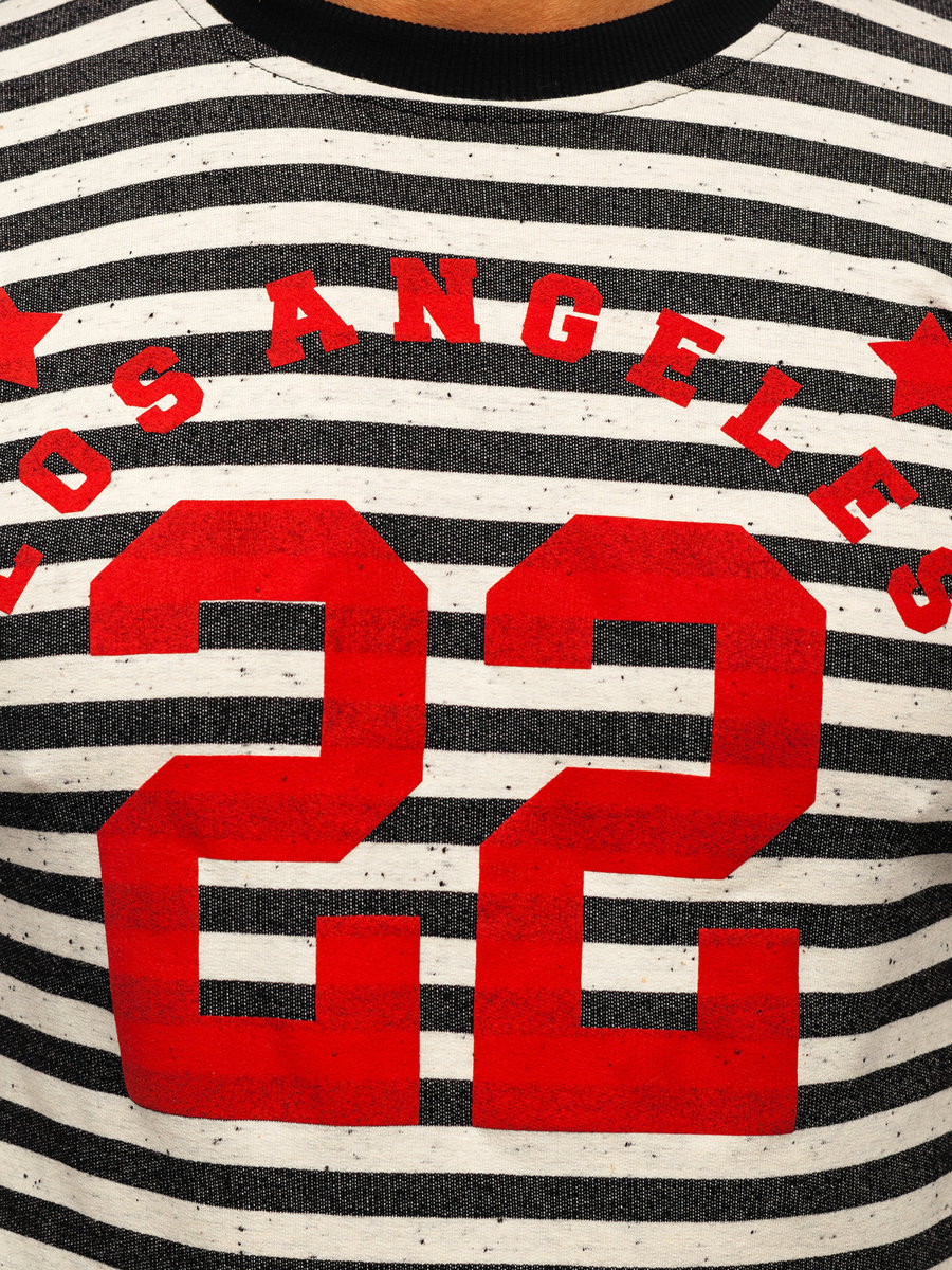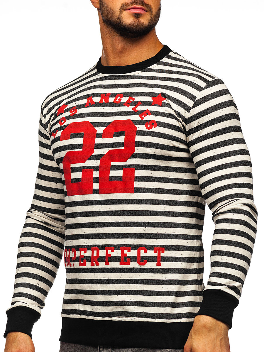 Striped men's sweatshirt by JDN is the perfect offer for the gym and impressive element of streetwear outfit. Universal cut in toned colours. Black and white stripes with red prints creates an interesting effect. It fits with jeans, shorts or cargo pants. You must match it with the most trendy red shoes.