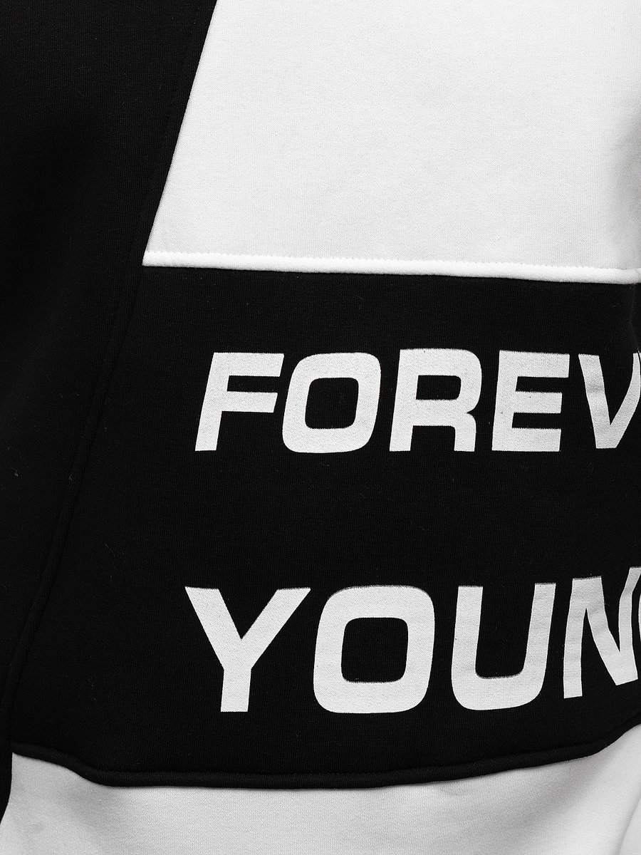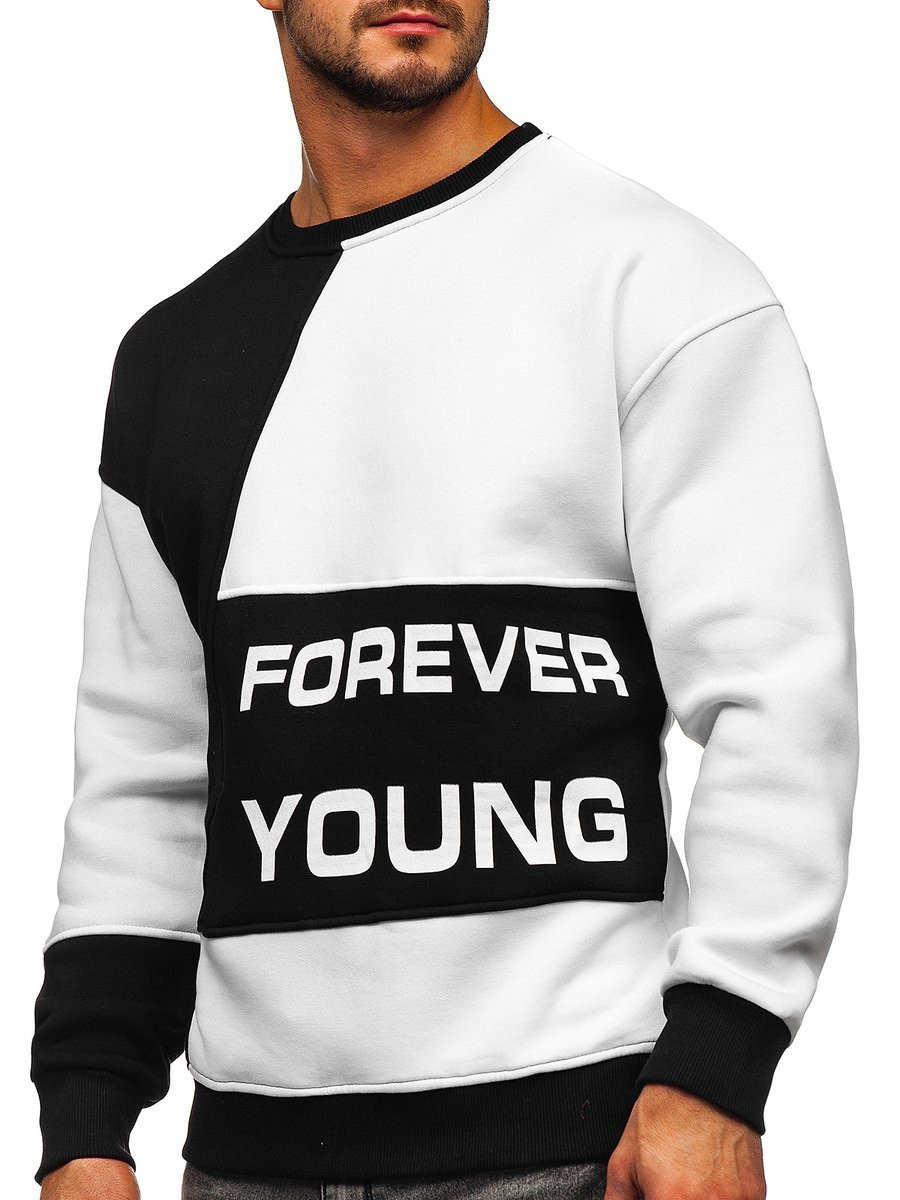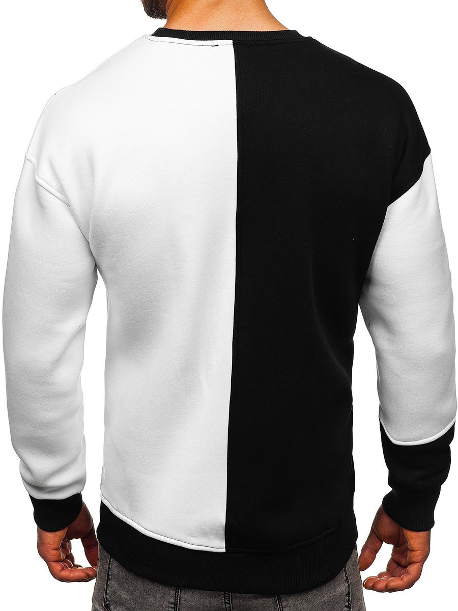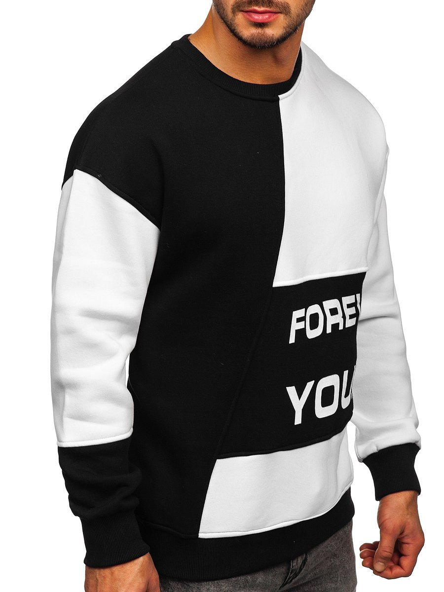 Perfect black and white men's printed sweatshirt from the JDN collection. Black and white sweatshirt is a must have in every men's wardrobe. It is put on over the head and has a designer print on the front. The sleeves and the bottom are finished with welts. The product will be perfect for walking, jogging, training in the gym or meeting with friends or during a trip to the city. It consists of 73% cotton and 27% polyester. It will look perfect with jeans and joggers.